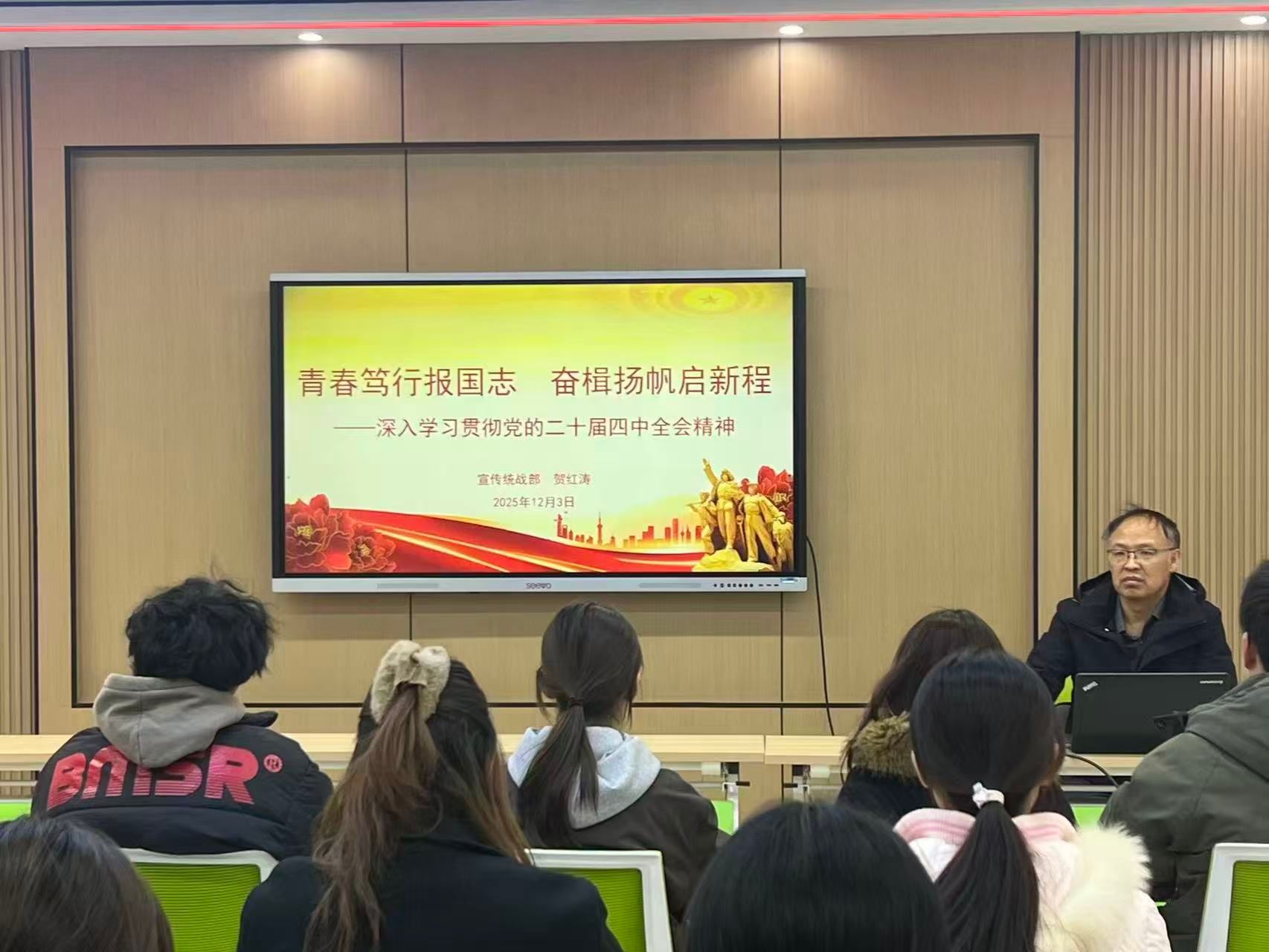 2025年12月3日,马克思主义学院教师贺红涛深入“一站式”学生社区,以“青春笃行报国志 奋楫扬帆启新程——深入学习贯彻党的二十届四中全会精神”为题,给学生作了一场深刻而生动的报告。