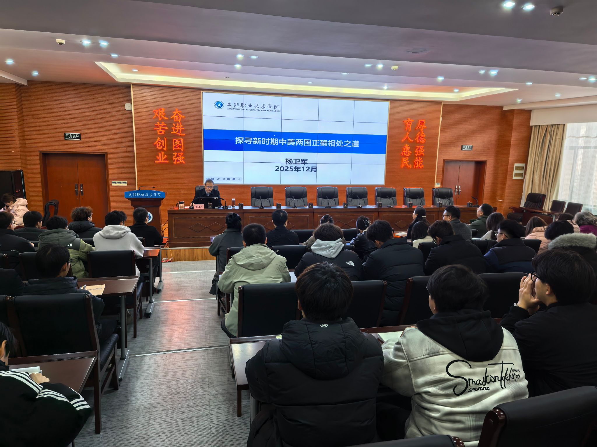 12月3日,咸阳职院院长杨卫军以“探寻新时期中美两国正确相处之道”为题,为机电(技师)学院学生讲授了一堂生动的形势与政策课。