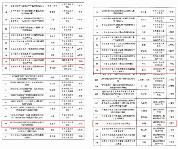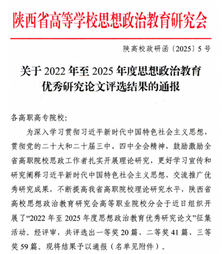 近日,陕西省高等学校思想政治教育研究会发布了关于2022年至2025年度思想政治优秀研究论文评选结果发布,咸阳职院马克思主义学院共5名老师论文获奖。其中郭媛媛老师论文获一等奖、蔺建英、姚薇、张悦老师论文获二等奖、张强老师论文获三等奖。