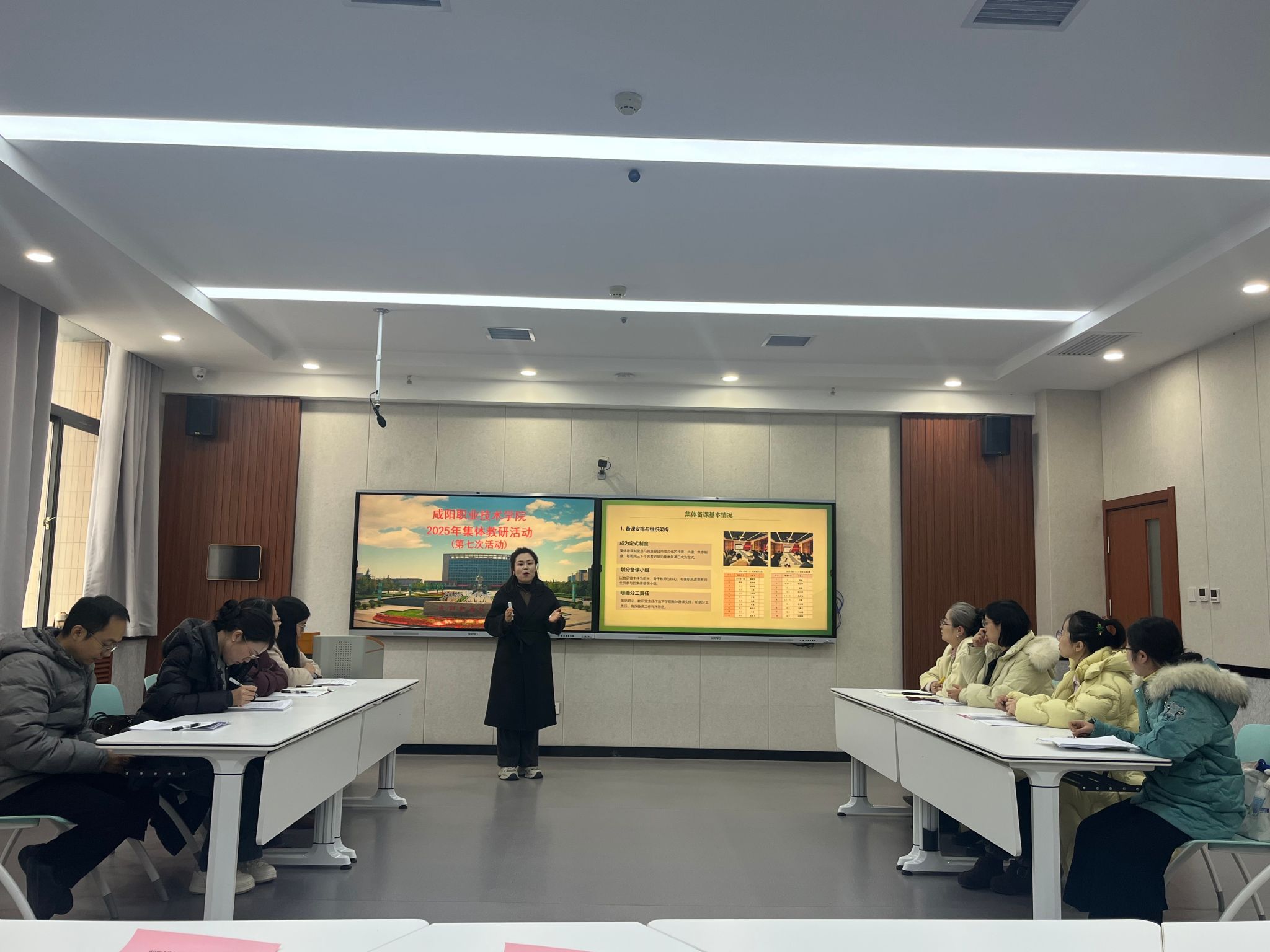 为进一步深化思政课程教学改革,提升教师教学与科研能力,推动“大思政课”体系建设,马克思主义学院于2025年12月31日下午开展了咸阳职业技术学院2025年第七次集体教研活动。本次活动由思想道德与法治教研室主任杨颖华主持,各二级学院负责人、教学副院长、教学办主任、教研室主任及教务处相关工作人员共同参与。