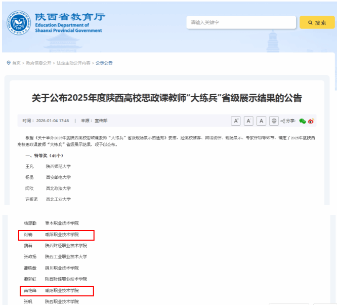 近日,陕西省教育厅公布2025年度陕西高校思政课教师“大练兵”省级现场展示获奖名单,我院三位教师凭借扎实的理论功底与精湛的教学能力脱颖而出。其中剡楠老师荣获《思想道德与法治》课程组特等奖,南艳峰老师荣获《毛泽东思想和中国特色社会主义理论体系概论》课程组特等奖,汪敏老师和小学教育专业2307班刘媛同学荣获师生团队组一等奖。获奖数量和质量均居全省高校前列,创下我院在该项赛事的最好成绩。