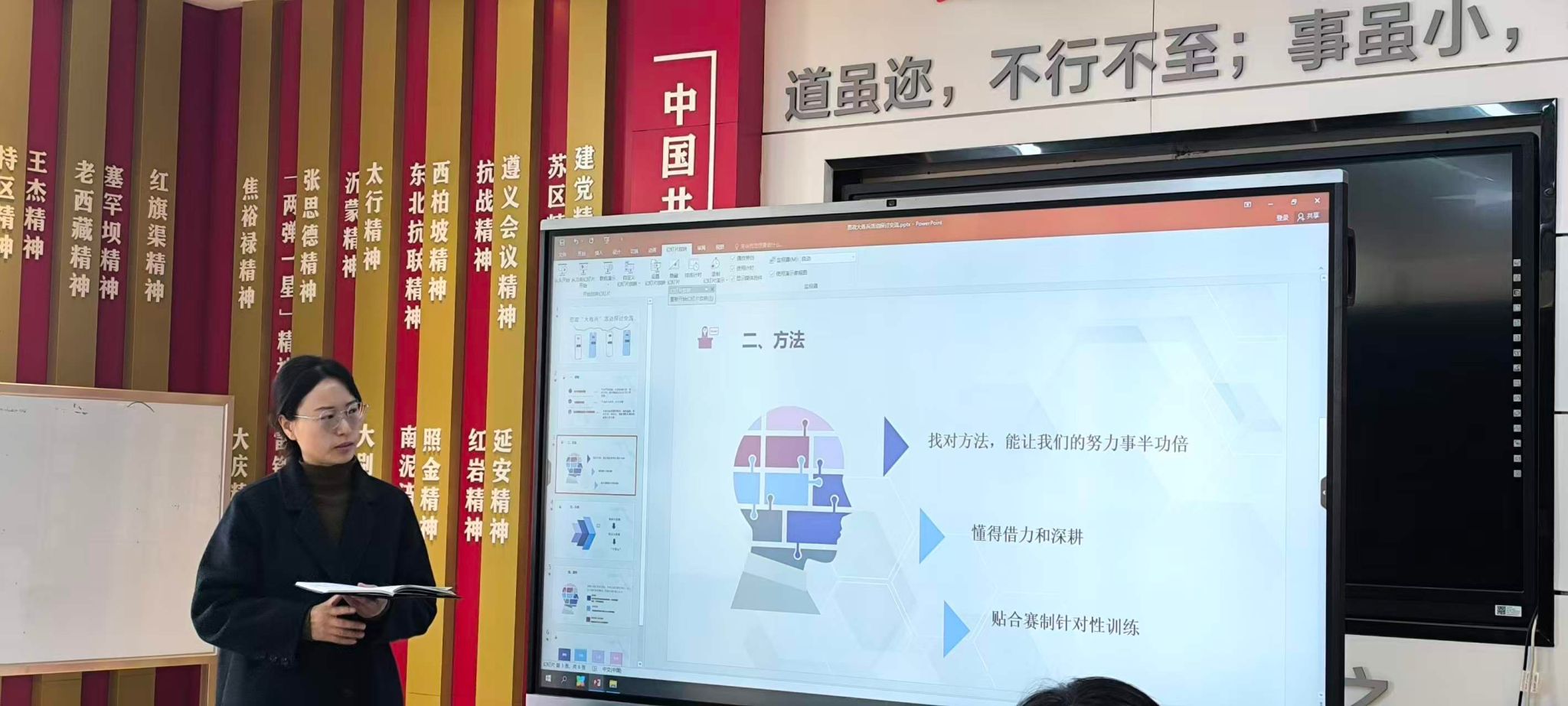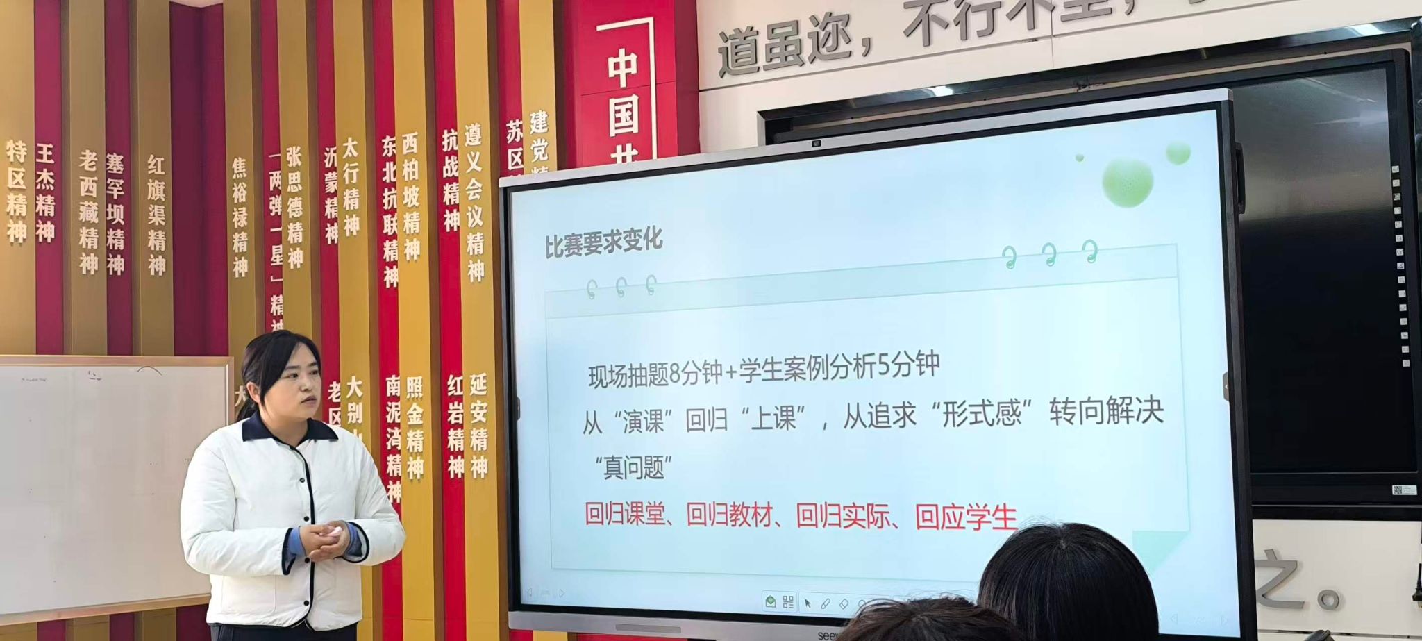 在经验分享环节,2025年陕西省思政课“大练兵”教学比赛“特等奖”获得者南艳峰、剡楠两位教师分别结合自身参赛经历,从选题策略、内容打磨、现场表现、心理调适等方面分享了宝贵的备赛经验。她们的分享内容详实、案例生动,为在场教师提供了可借鉴的思路和方法,赢得了阵阵掌声。