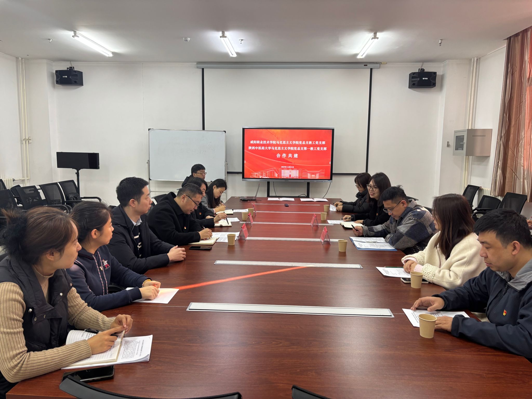 活动在陕西中医药大学马克思主义学院举行,由该院副院长曲光明主持。陕西中医药大学马克思主义学院党总支书记马真、第一教工党支部书记蔡心,咸阳职业技术学院马克思主义学院党总支书记乔璐、教工党支部书记兼副院长梁鹏,以及两院党员教师代表共同参加。马真书记代表陕西中医药大学马克思主义学院对乔璐书记一行的到来表示热烈欢迎。她指出,此次活动是两院基层党组织加强互动、深化合作的重要契机,希望以共建促党建,以党建促业务,共同提升基层党组织的政治功能和组织功能,推动党建与教学科研深度融合。